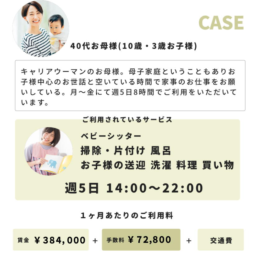 シッター契約だけど、子供とお出かけするので家事のみを頼みたい・・・という時ってありますよね。弊社シッターサービスは就労日によって就労内容(家事代行・シッターサービス)の変更が可能です。家事代行のみの日は、よりお安い家事の料金設定になります。