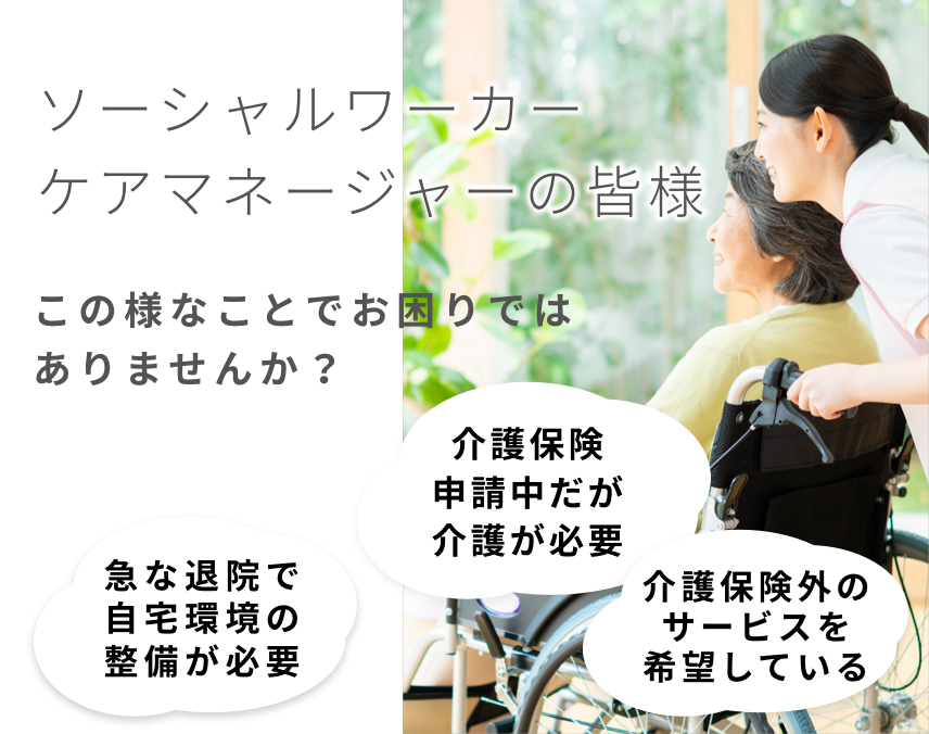もし介護保険での対応をご検討されている場合は担当のケアマネージャーとのご相談のうえ最寄りの居宅介護保険事業所、またはやさしい手訪問介護事業所をご利用ください。介護保険サービス時間終了後、弊社ケアワーカーをご利用いただきますようお願い致します。